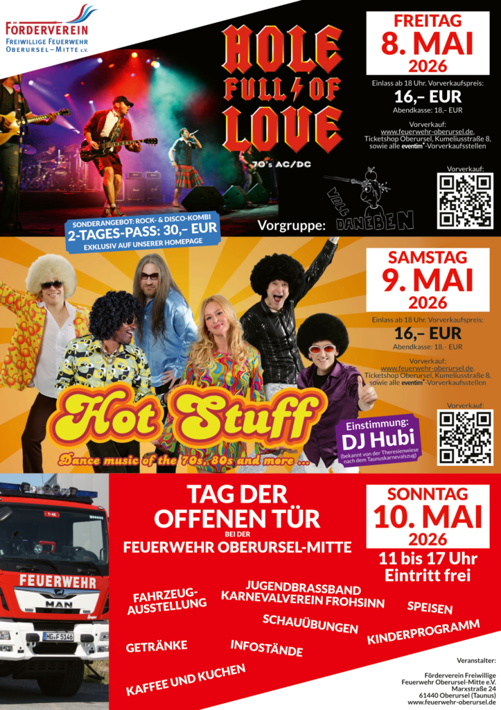 Wie an jedem Tag ist für das leibliche Wohl ausreichend gesorgt. Veranstaltungsort: Gerätehaus der Feuerwehr Oberursel-Mitte, Marxstraße 24, Oberursel. Die Karten kosten im Vorverkauf 16,- EUR und an der Abendkasse 18,- EUR. Vorverkauf hier im Internet, im Ticketshop Oberursel, Kumeliusstraße 8, Oberursel oder an allen anderen eventim-Vorverkaufsstellen. Je nach VVK-Stelle fallen zusätzliche Gebühren an. Über unseren Link und zum Selbstausdrucken fallen keine weiteren Gebühren an.